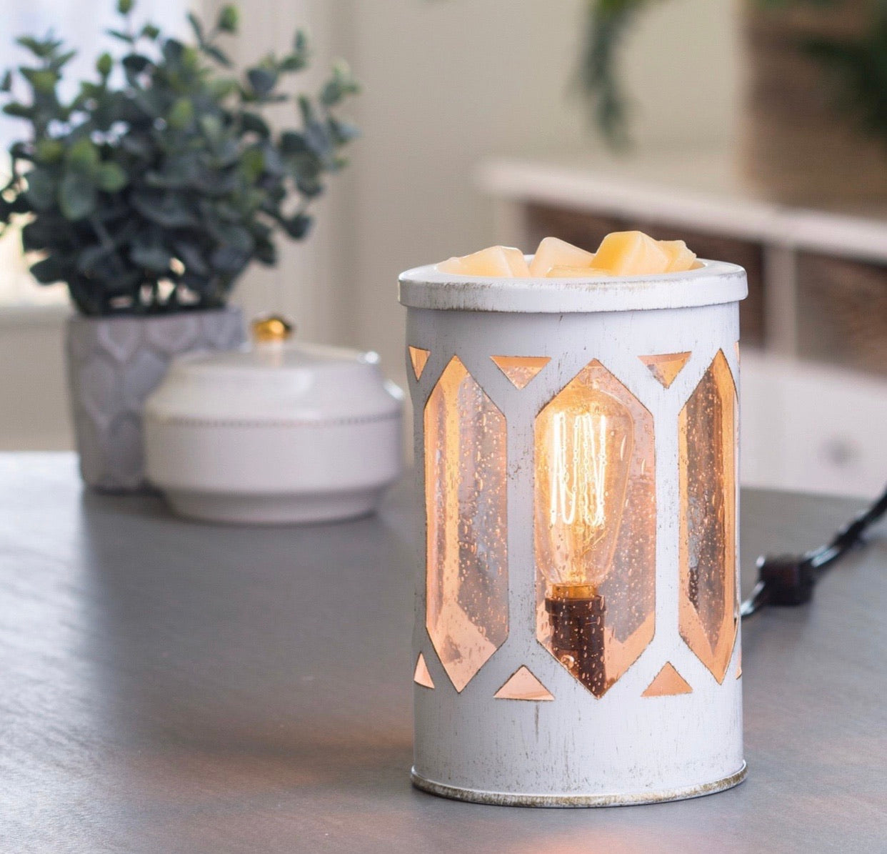 This Arbor Wax Warmer has the decor feel of a vintage garden with an exposed bulb and it’s white metal design.