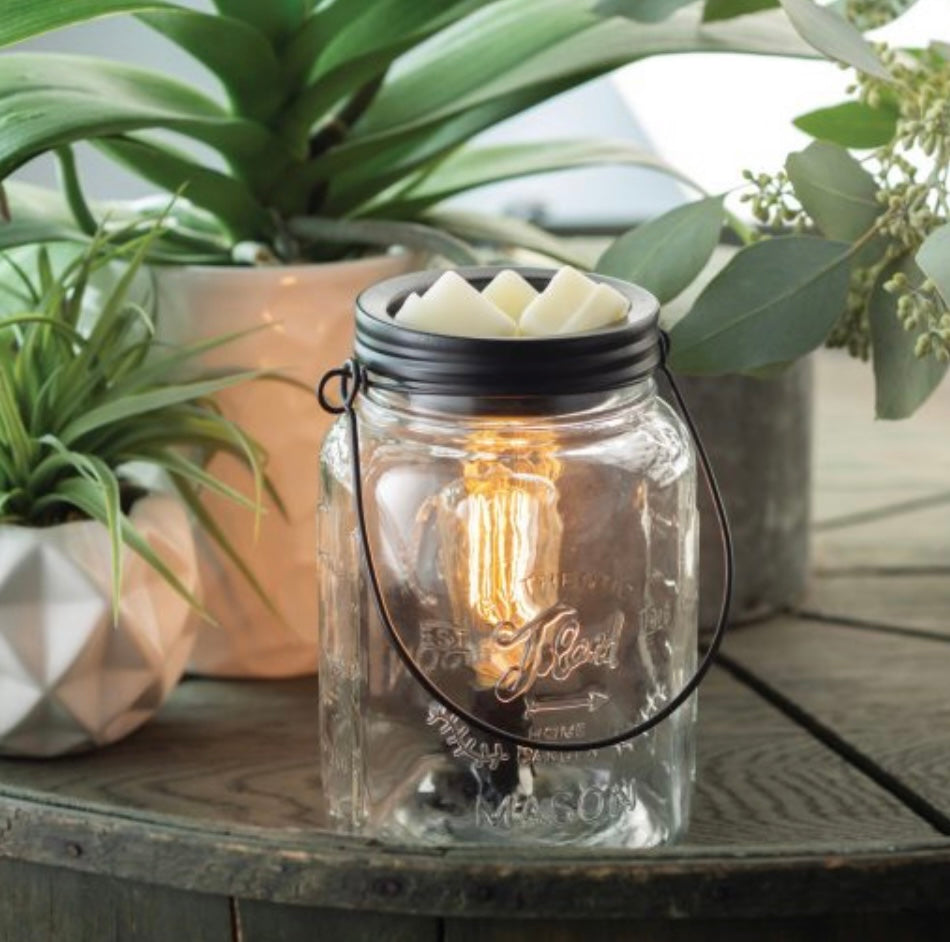 A repurposed feel applied to the traditional Mason Jar with glass and a matte black warming dish and handle, all beautifully lit by the vintage style warming bulb.